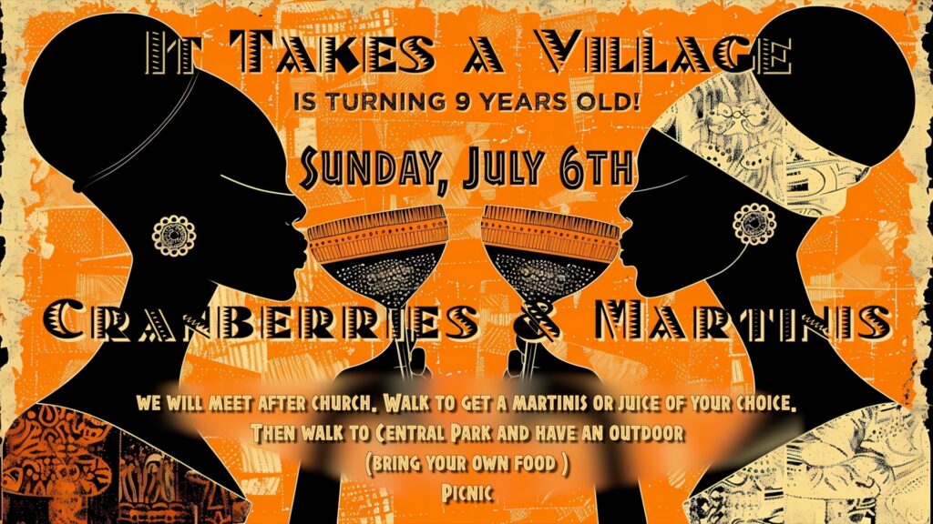 IT TAKES A VILLAGE Unity's Women's Group is turning 9 years old! Sunday July 6th, 3:30PM We will meet after church, walk to get martinis…